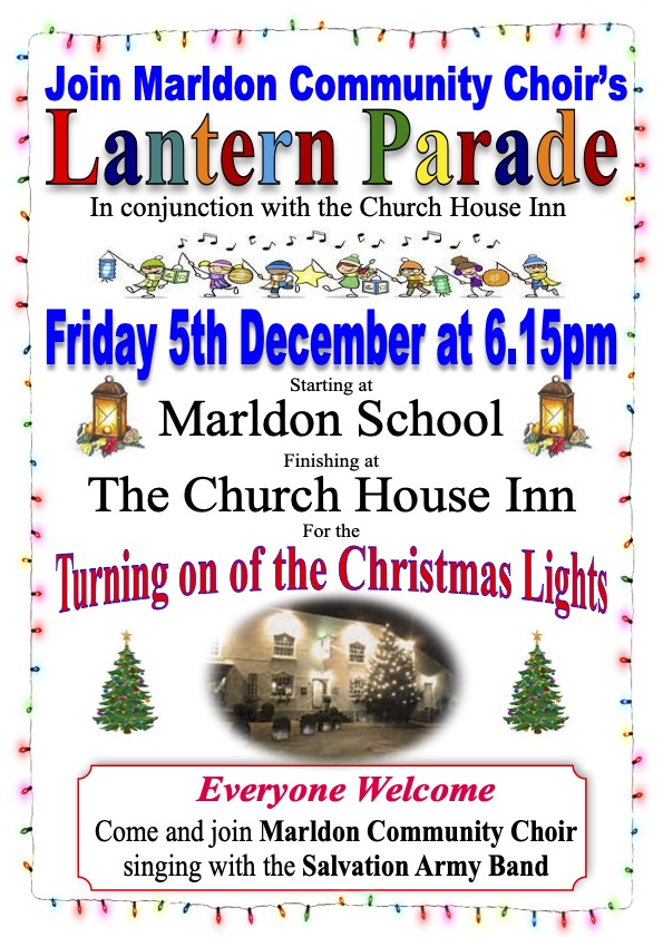 It’s that time of the year again. Do come and join us -we will be leaving from outside Marldon Primary School at 6.15pm then walking down through Marldon with Father Christmas to the Church House Inn, arriving at about 6.30pm. There we will join the Salvation Army singing carols while the children help Father Christmas turn on the lights on the Christmas tree.